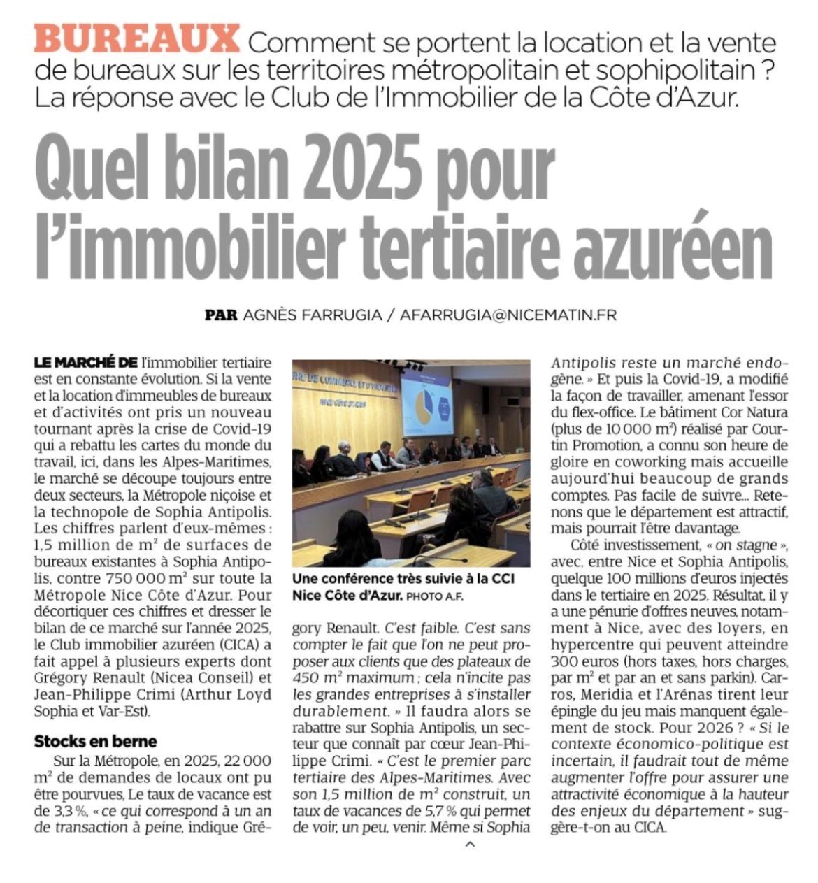 “Comment se portent la location et la vente de bureaux sur les territoires métropolitain et sophipolitain ? La réponse avec le Club de l’Immobilier de la Côte d’Azur.” – Nice Matin