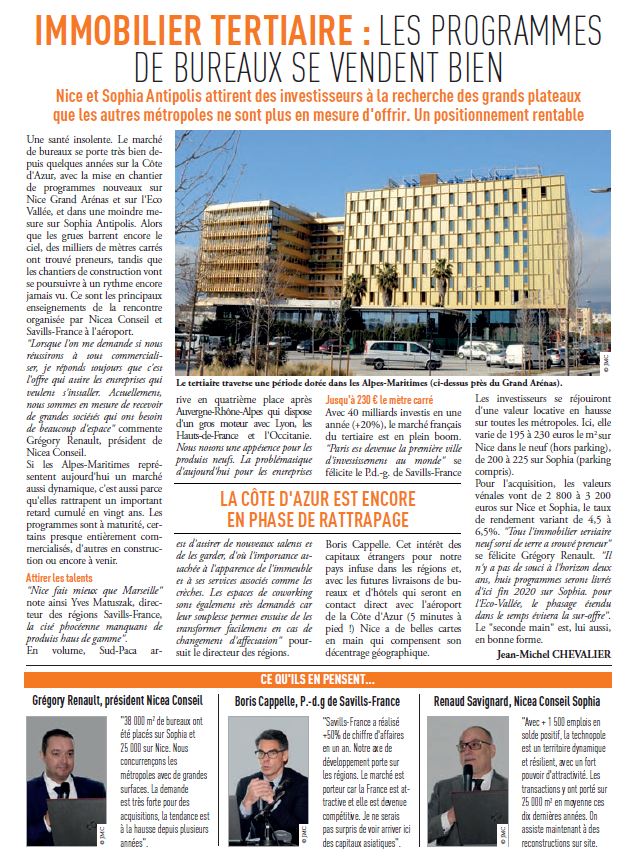 Une santé insolente. Le marché de bureaux se porte très bien depuis quelques années sur la Côte d’Azur, avec la mise en chantier de programmes nouveaux sur Nice Grand Arénas et sur l’Eco Vallée, et dans une moindre mesure sur Sophia Antipolis. Alors que les grues barrent encore le ciel, des milliers de mètres carrés ont trouvé preneurs, tandis que les chantiers de construction vont se poursuivre à un rythme encore jamais vu. Ce sont les principaux enseignements de la rencontre organisée par Nicea Conseil et Savills-France à l’aéroport.